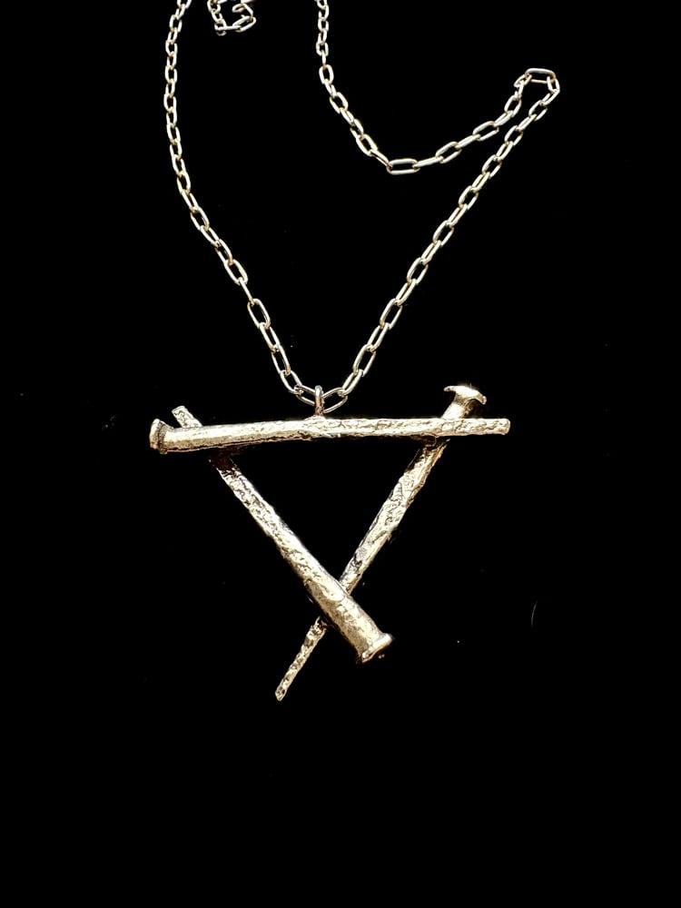 Three coffin nails as an inverted triangle representing femininity, the alchemical symbol for water, and a talisman for protection.
